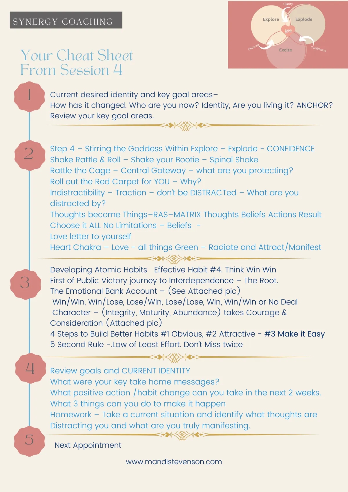 Mandi will take you through her unique S2S model designed to suit the program you select . Intuitive individual coaching and feedback on your own challenges and dreams to set you up for success.